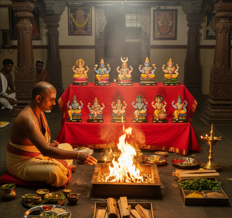 The Navagraha Homam is dedicated to the nine planets (Sun, Moon, Mars, Mercury, Jupiter, Venus, Saturn, Rahu, and Ketu). Since planetary positions influence human destiny, this homam is performed to reduce the negative effects of unfavorable planetary doshas and to strengthen positive influences. It is one of the most widely prescribed remedies in Nadi astrology.