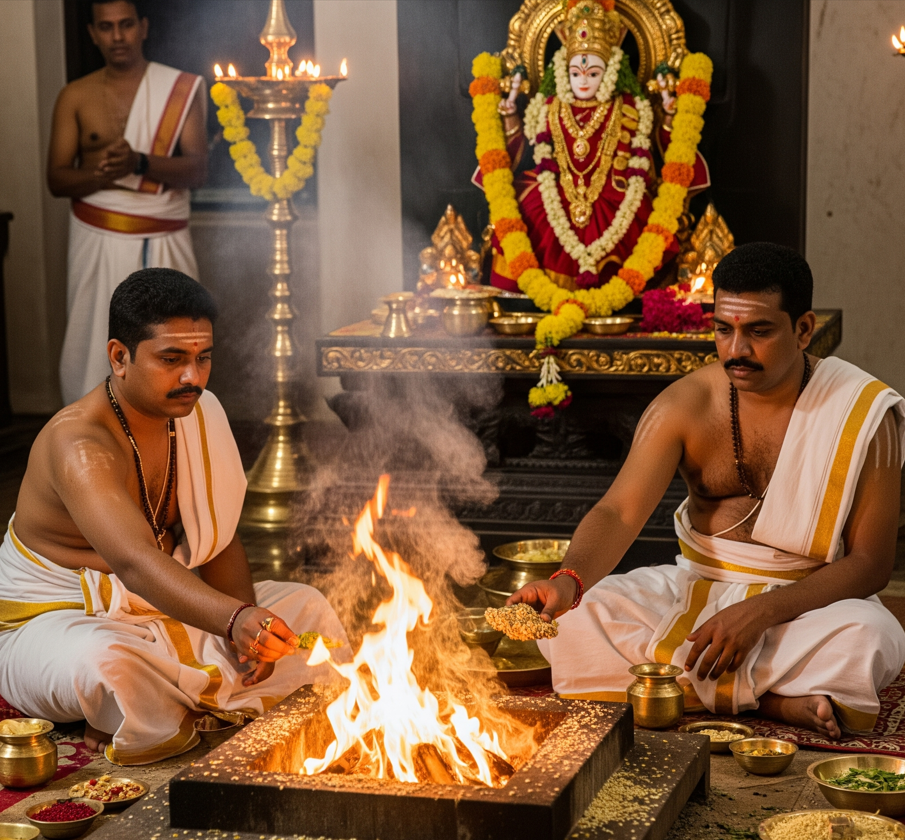This homam is performed in devotion to Goddess Kamakshi, who grants the blessing of children. For couples struggling with delays in childbirth or seeking blessings for healthy progeny, this homam is highly effective. It also ensures the well-being, education, and future of children.